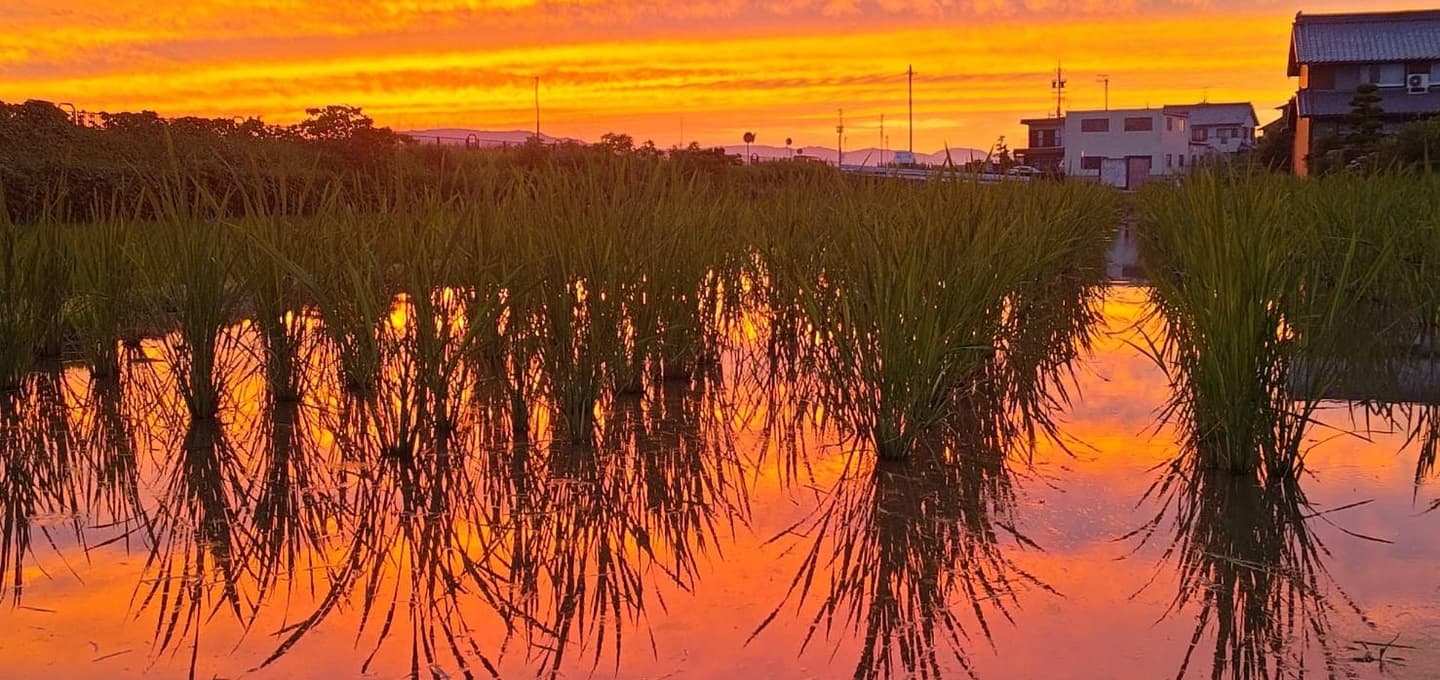 注連縄飾りは真菰を五つ重ねの和にして森羅万象から生まれる命を赤い稲穂で表しました。形は、願いが叶う玉、如意宝珠。稲穂は天橋立の籠神社の御新米神丹穂で、真菰圃場で一緒に育てています。(白いしずくの中にはいっています。)