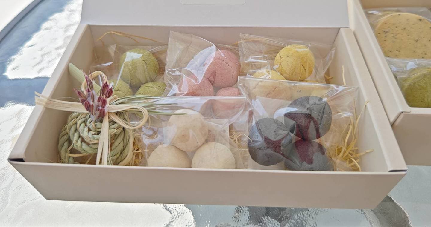 まこもの鮮やかな緑色、紫芋のやわらかな赤色、秋ウコンの元気な黄色、まこも炭の大地の黒色、古代米の優しい白色。一つ一つに味わいがあり、紫色には白みそ、黄色にはほんのりピリっとした和胡椒が隠し味としてはいっています。
